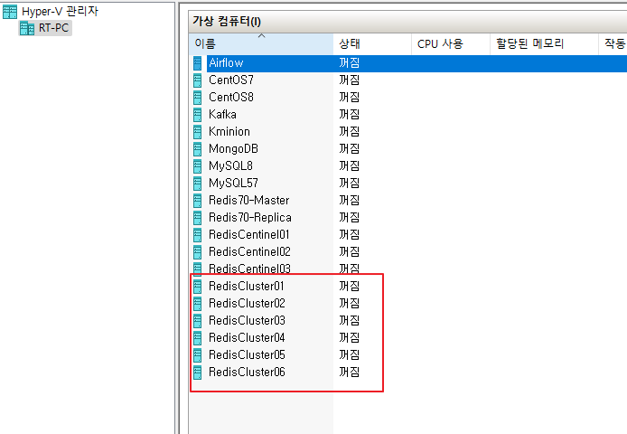 Powershell 로 E:\Hyper-V\RedisCluster01 ~ E:\Hyper-V\RedisCluster06 으로 복원한다.